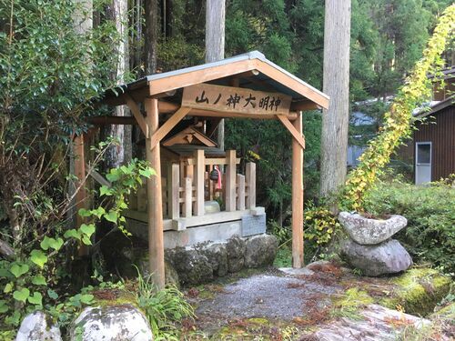 【山ノ神大明神】(やまのかみだいみょうじん)奈良県吉野郡 洞川温泉へ到着する寸前に「ようこそ洞川温泉へ」の看板が見えます。道沿いに山神の祠があります。由緒等は不明です。 所在地:奈良県吉野郡天川村洞川 (撮影:2016/10/26)